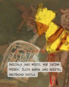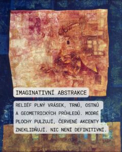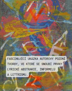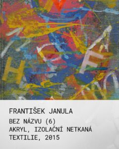 20. František Janula, Bez názvu (6), akryl, izolační netkaná textilie, 2015 Toto dílo od Františka Januly z roku 2015 představuje fascinující ukázku autorovy pozdní tvorby, ve které se snoubí prvky lyrické abstrakce, informelu a lettrismu. Janula, který většinu svého života prožil v Paříži, si v tomto obraze uchovává svou typickou hravost a smysl pro barvu. Obraz je postaven na komplexním vrstvení. Podklad tvoří tmavá, strukturovaná plocha, na kterou autor nanáší dynamické nánosy barev. Dominuje zde kontrast primárních barev – zářivě žluté, sytě modré a červené, které jsou doplněny bílými a růžovými akcenty. Tato paleta dodává dílu silnou vnitřní energii a vitalitu, která je pro Janulu příznačná i ve vysokém věku. Výrazným prvkem jsou písmena (H, F, Z, V) rozesetá po ploše. Nejsou zde proto, aby tvořila slova, ale fungují jako svébytné grafické znaky. Tento přístup odkazuje na tradici lettrismu, kde se písmo stává vizuálním symbolem zbaveným původního sémantického významu. Kompozice působí na první pohled spontánně, až chaoticky, ale při bližším zkoumání odhaluje promyšlenou rovnováhu. Janula mistrně pracuje s prostorem; barvy a písmena jako by „pluly“ v neurčitém meziprostoru, což vytváří dojem hloubky a neustálého pohybu. V díle je cítit vliv poválečné pařížské abstrakce, kterou Janula v emigraci nasál, ale zároveň si uchovává středoevropskou citovost. Je to dialog mezi gestem a symbolem. Dílo je důkazem, že i v posledním desetiletí svého života zůstal František Janula autorem s neobyčejně moderním a energickým projevem.