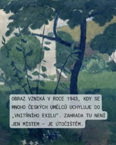 21. Václav Bartovský, Zahrada, olej, plátno, 1943 Dílo Václava Bartovského s názvem Zahrada z roku 1943 představuje vynikající ukázku české intimně laděné malby válečného období. Bartovský, klíčová postava Skupiny 42 a později souboru Trasa, v tomto obraze zkoumá hranice mezi civilismem a lyrickou abstrakcí. Obraz je vystavěn na principu vrstvení plánů. Popředí dominují vertikální linie subtilních keřů a travin, které tvoří jakousi průhledovou clonu k hlavnímu motivu stromu a domu v pozadí. Tato kompozice vtahuje diváka do tichého, uzavřeného mikrosvěta zahrady. Autor pracuje s úzkou, ale bohatě nuancovanou škálou tmavě zelených, tlumených modrých a okrových tónů. Bílá barva domu v pozadí funguje jako světelný akcent, který prosvětluje jinak melancholickou náladu díla. Tah štětcem je uvolněný, téměř impresionistický, ale s důrazem na plošnost a pevnou vnitřní stavbu. Bartovský zde neopisuje realitu detailně, ale spíše zachycuje atmosféru a světelný dojem okamžiku. Rok 1943 byl pro české umělce obdobím vnitřního exilu. Útěk k tématům zahrad, dvorů a tichých zákoutí byl častým způsobem, jak čelit úzkosti z válečné reality. Zahrada zde nepředstavuje jen botanický prostor, ale symbolizuje bezpečí, soukromí a tichou kontemplaci. Přestože je Bartovský spojován s civilismem Skupiny 42, jeho pojetí je mnohem více introspektivní a poetické. Na rozdíl od technicistních motivů svých kolegů se Bartovský soustředí na vztah člověka k bezprostřednímu okolí a na „všednost“, která je povýšena na umělecký objekt. V díle je patrná inspirace francouzským postimpresionismem (např. Pierrem Bonnardem) v důrazu na intimitu a barvu jako nositelku nálad. Zahrada je důkazem Bartovského schopnosti najít v obyčejném námětu hluboký psychologický rozměr. Obraz není pouhou krajinomalbou, ale meditací o klidu a řádu uprostřed neklidné doby. Pro autora je typická právě tato střídmost výrazu, která však v divákovi zanechává silný emotivní dojem.