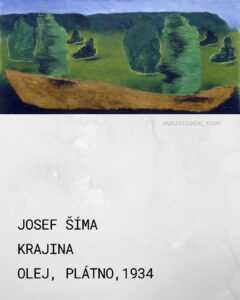 11. Josef Šíma, Krajina, olej, plátno, 1934 Umělecký historik František Šmejkal popisuje Šímovu tvorbu jako nadčasovou existenci, která neodpovídá překotnému rytmu moderní doby. Není nápadná, nešokuje a neopírá se o novou techniku, nikoho nepřipomíná – „Prostě existuje.“ Dílo představuje krajinu jako výtvarné univerzum a archetypální symbol, který může být nalézán v podstatě kdekoli. V kompozici se rozplývají gravitační principy a jednotlivé komponenty (půda, stromy, obloha) se mění v nehmotné a pohybující se znaky. Tvorba je transformována v básnickou kontemplaci přírody, která vyrůstá z hluboké meditace o podstatě světa a bytí. Typická Šímovská scenérie složená z půdy, stromů a lesů je důmyslně vyvážena s jemností oblohy. Celé dílo se tak proměňuje v básnickou kontemplaci přírody, vyrůstající z hluboké meditace o podstatě světa a bytí v něm. Taková je celá tvorba Josefa Šímy.