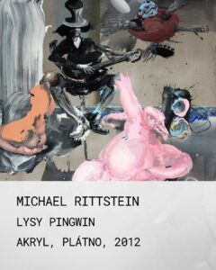 16. Michal Rittstein, Lysy pingwin, akryl, plátno, 2012 Dílo Lysy pingwin od Michala Rittsteina je charakteristickým příkladem autorovy expresivní figurální malby a jeho jedinečného přístupu k zachycení současného života prostřednictvím grotesky, ironie a sarkasmu. Obraz je malován jeho typickým energickým a gestickým rukopisem s výraznou tvarovou nadsázkou a deformací. Autor se vyznačuje bravurním koloritem, i když v tomto díle převažují tlumené šedé a černé tóny, kontrastující s jasnými a hutnými odstíny růžové. Rittstein tematizuje mezilidské, často intimní vztahy, a zachycuje příběhy ze zdánlivě všedního života, které však transformuje v bizarní a dramatické alegorie. Děj je fragmentární, evokující momentálně zachycenou absurdní situaci, která připomíná karikaturu nebo scénu z jakési surrealistické performance. Dominantní postava, pravděpodobně onen „Lysy pingwin“, je namalována v expresivním gestu s hutnými nánosy sytě růžové barvy. Její tělesná podoba je deformovaná a masitá, působí dojmem komické bezmocnosti nebo extatického vzepětí. Lysy pingwin zapadá do Rittsteinova celoživotního zkoumání lidského údělu a vztahů. Postavy jsou vytrženy z kontextu a vystaveny vší své nelichotivé realitě – ať už jde o tělesnost, masky, nebo snahu o sebedefinici skrze společenské role (muzikant, pingwin, divák). Obraz může být interpretován jako alegorie současného života, kde se mísí snaha o zábavu s groteskní odevzdaností a existenciální samotou. Název Lysy pingwin podtrhuje princip záměrného mísení lidského a zvířecího, čímž demaskuje člověka v jeho přirozených, nefiltrovaných a často směšných polohách. Dílo odráží Rittsteinovu schopnost vést dialog s divákem prostřednictvím vizuálně provokativního a emocionálně silného vyprávění, které v sobě nese jak cynismus, tak i jistou humanistickou shovívavost.