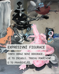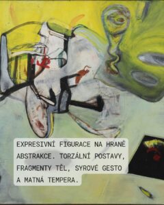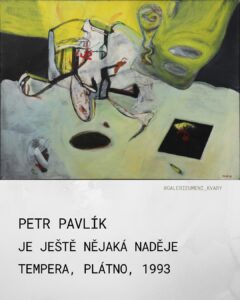18. Petr Pavlík, Je ještě nějaká naděje, tempera, plátno, 1993 Dílo Ještě je nějaká naděje od Petra Pavlíka představuje intenzivní a emocionálně nabitou malbu, která spadá do kontextu české postmoderní expresivní figurace po roce 1989. Pavlík je známý svým dynamickým, často syrovým rukopisem a zaměřením na existenciální témata, v nichž se mísí prvky abstrakce, gesta a torzální figury. Obraz je proveden kombinovanou technikou (tempera na plátně), což přispívá k jeho matnému a hutnému povrchu, typickému pro expresivní malbu 90. let. Autor využívá silného expresivního gesta a výrazných barevných kontrastů. Dílo reflektuje dobovou atmosféru po roce 1989, která s sebou nesla uvolnění, ale zároveň i novou nejistotu. Obraz je plný fragmentů, symbolů a nejednoznačného významu, což odpovídá postmodernímu přístupu. Pavlík během své tvorby záměrně otáčí plátnem tak dlouho, dokud zcela neznejasní všechny potenciální významy. Název „Ještě je nějaká naděje“ je klíčový. Vnáší do chaotické a rozložené kompozice emocionální a existenciální otázku. Téma naděje je konfrontováno s vizuální destrukcí a rozkladem.