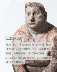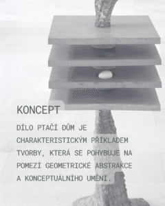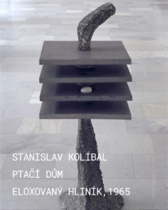 6. Stanislav Kolíbal, Ptačí dům, eloxovaný hliník, 1965 Dílo Ptačí dům od Stanislava Kolíbala je charakteristickým příkladem jeho tvorby, která se pohybuje na pomezí geometrické abstrakce a konceptuálního umění. Objekt je založen na přísné, ale narušené geometrické kompozici. Vertikální organická hmota je důmyslně přeťata přísně horizontálními deskami. Tyto desky vytvářejí dojem etáží, pater pomyslného domu. Uprostřed nich je v meziprostoru umístěno malé vejce. Tento drobný prvek je významným metaforickým detailem, který dává dílu název a posouvá čistou geometrii do roviny symbolické. Kolíbal často pracoval s kontrastem materiálů a tvarů, což je zjevné i zde. Název Ptačí dům spolu s drobným vejcem zavádí do díla prvek příběhu – dům jako archetypální místo ochrany, zrození a křehkosti života. Kontrast civilizace a přírodní organiky je tak v rovině obsahu propojen s úvahou o životě a jeho důležitém místě.