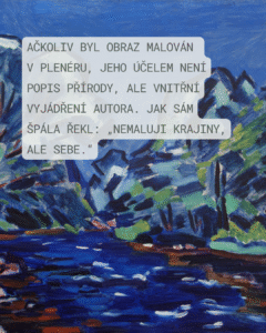 5. Václav Špála, Krajina, olej, plátno, 1928 Tato krajina je esencí Špálova přístupu ke skutečnosti, který je charakteristický pro jeho Modré období. Špála zde dosáhl mistrovského spojení expresivní energie a geometrizující formální zkratky, vycházející ze znalosti postimpresionistického a kubistického umění. Obraz je postaven na harmonické, avšak energické orchestraci pouhého kvarteta barev (ultramarínová modř, zelená, bílá, červená). Ultramarínová modř, inspirovaná dalmatskými cestami, dominuje hladině řeky (pravděpodobně Otavy) a tvoří základní emocionální naladění díla. Motiv je zjednodušen do jasných a sytých ploch s pádnými tahy štětcem. Stromy jsou redukovány na elementární tvary, které vyjadřují řád i harmonii přírody. Ačkoliv byl obraz malován v plenéru, jeho účelem není popis přírody, ale vnitřní vyjádření autora. Jak sám Špála řekl: „Nemaluji krajiny, ale sebe.“ Dílo tak rezonuje chválou slunce, přírody a života, zachycenou v rytmickém souznění barev a tvarů.