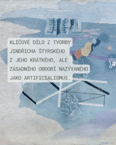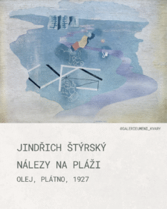 9. Jindřich Štýrský, Nálezy na pláži, olej, plátno, 1927 Obraz Nálezy na pláži z roku 1927 je klíčovým dílem z tvorby Jindřicha Štyrského a spadá do jeho krátkého, ale zásadního období nazývaného jako artificialismus. Umělecký směr, který definoval společně s malířkou Toyen v roce 1926. Umělec se v tomto díle soustředil na subjektivní vizi a imaginaci vyjádřenou skrze elementární vizuální znaky a lyrickou barevnost. Cílem byla „malba, která se stává poezií“. Nálezy na pláži představují umělou imaginární krajinu. Jakýsi „mentalizovaný“ prostor – jeviště pro manifestaci pocitů, psychických stavů a vzpomínek na vzpomínky. Prostor je iluzivní, je definován barevnými přechody modré a fialové, které vytvářejí dojem vodní hladiny, písku a vzdálené krajiny/moře. Na této ploše plují či leží geometrické a organické fragmenty, které představují ony nálezy. Samotný název díla evokuje proces objevování neznámých, poetických objektů a stop, které jsou vytrženy z reálného kontextu. Artificialismus neusiloval o malování snů, ale o malování pocitů, které jsou skrze tyto zbytkové a nalezené znaky evokovány. Dílo je křehkou vizuální básní o tajuplnosti, melancholii a pomíjivosti všech okamžiků.
