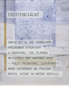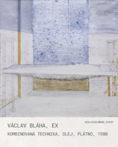 Obraz Ex z roku 1980 je charakteristickým příkladem tvorby Václava Bláhy, významného českého malíře a grafika. Dílo spadá do období, kdy se Bláha intenzivně věnoval tématu lidské figury a prostoru, která jsou pro jeho ranou i zralou tvorbu klíčové. Jak napovídá samotný název Ex, dílo je odkazem k vystoupení nebo absenci. Lze jej interpretovat jako symbolické vyjádření opuštění prostoru, ztráty či paměti po něčem, co zde kdysi bylo – typicky po lidské figuře a jejích vztazích s prostředím. Tato prázdnota je častým odrazem tehdejší společenské a existenciální situace. Bláhova práce se vyznačuje důrazem na strukturu, hmotu a dotyk, což je patrné i v tomto díle. Převládají tlumené tóny – bílá, šedá, světle modrá a okrové či zlatavé akcenty. Tato redukovaná paleta vytváří chladnou, zamyšlenou atmosféru, typickou pro mnohá díla tzv. „šedé zóny“ českého umění 70. a 80. let. Václav Bláha je malířem, pro kterého je vnitřní svět silně rezonující s tím vnějším. Ex je tak nejen formálním průzkumem struktury a prostoru, ale především metaforou pro vnitřní stav – pocit vyloučení, uzavřenosti nebo vzpomínky na prázdné místo, které po něčem zůstalo. Je to dílo, které svým existenciálním nábojem silně vypovídá o atmosféře českého umění 80. let 20. století.