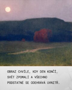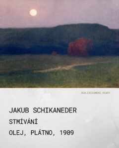 17. Jakub Schikaneder, Stmívání, olej, plátno, 1909 Dílo Stmívání Jakuba Schikanedera patří mezi mistrovská díla karlovarské sbírky umění. Představuje fascinující odklon od autorovy typické „městské krajiny“ k volné, náladové krajinomalbě. Obraz je vrcholným příkladem Schikanederovy práce na pomezí symbolismu a pozdní secese s důrazem na melancholii, ticho a samotu. Schikaneder, ačkoliv byl existenčně zajištěn jako profesor dekorativní malby na Uměleckoprůmyslové škole v Praze (1890–1922), byl umělcem, v jehož tvorbě téměř výhradně rezonovaly tóny smutku a samoty. Ačkoliv je volný krajinný námět u Schikanedera spíše ojedinělý, Stmívání mistrně vystihuje atmosféru pomalu usínající krajiny a blížící se tmy. Obraz má klidnou, horizontálně členěnou kompozici a je charakteristický tlumenou barevností. Dvojí světlejší zeleň luk v popředí, přes které se klikatí světlejší cesta, fascinuje svou vizuální přitažlivostí i současného diváka. Dominantní, avšak tlumené prvky, včetně červeně zbarvených keřů (snad podzimních). Temně zelený pás lesů s hlubokými černými stíny, nad nímž se zvedá silueta kopce v šeřící se krajině – To všechno dodává dílu jistou magickou působivost a násobí kouzelné síly. Celý výjev je prosycen dojmy ticha, klidu, opuštěnosti a nostalgie. Schikaneder zde uplatňuje techniku, která využívá rozostřené barevné plochy a plynule přecházející valéry bez viditelných tahů štětcem. Stmívání Schikanedera zařazuje do proudu evropského symbolistního krajinářství, které se snažilo zachytit spíše vnitřní psychický stav a náladu nežli pouhou objektivní realitu. Nostalgický opar a důraz na pomíjivost a osamělost spojuje toto dílo s jeho slavnými pražskými nokturny, přestože motiv je tentokrát čistě krajinný. Stmívání je bravůrním dílem ve schopnosti vyjádřit emoce ticha a melancholie prostřednictvím světla a barevné tlumenosti, čímž si udržuje svou silnou a magickou přitažlivost i pro dnešní diváky.
