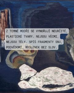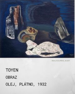19. Toyen, Obraz, plej, plátno, 1932 Dílo Obraz od Toyen, Marie Čermínové reprezentuje ranou a klíčovou fázi její surrealistické tvorby, krátce po vyhlášení artificialismu a před založením Skupiny surrealistů v Československu. Dílo spadá do surrealistické polohy tvorby. Z barevné struktury se na plátně vydělují plastické novotvary a záhadné, neurčité objekty. Převládá hluboká, temná modř, která vytváří pocit nočního, podvodního nebo snového prostředí. Temné, neskutečné prostředí slouží k zasazení objektů. Objekty nabývají nových, symbolických a fantazijních významů, které jsou pro diváka často nedešifrovatelné. Obraz vizuálně ilustruje její vlastní slova: „V temném sále života se dívám na projekční plátno svého mozku“. Dílo je tedy přímou vizuální projekcí vnitřního, podvědomého světa autorky. V rámci uměleckého vyjádření Toyen kombinuje zdání geologických forem s organickými fragmenty, které plavou v modré, hlubinné imaginaci. Plastické tvary vystupující z plátna využívají techniku, která sice stojí na pomezí abstraktních forem, ale jejich iluzivní modelace poukazuje na snovou realitu, typickou pro surrealistické zobrazení. Toyen zůstala věrná surrealismu i po druhé světové válce v Paříži, kde navázala na své předválečné kontakty s André Bretonem. Její odkaz spočívá v trvalém, nekompromisním a originálním vizuálním průzkumu hranic mezi realitou, snem a podvědomím, čímž si zajistila trvalé místo mezi světovou uměleckou elitou.