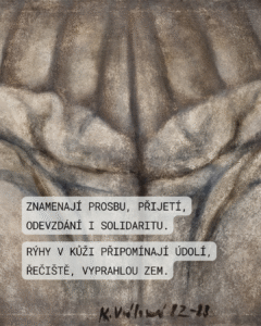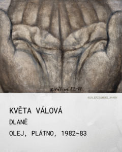 Dílo Květy Válové, jedné z nejvýraznějších postav české poválečné malby a členky skupiny Trasa, představuje hluboce humanistickou a existenciální výpověď. Obraz Dlaně z roku 1982 patří k ikonickým ukázkám její tvorby. Téma lidských rukou provází Květu Válovou po celou dobu její tvorby, avšak v 80. letech dosahuje maximální monumentality a symbolického zjednodušení. Otevřené dlaně směřující vzhůru jsou univerzálním gestem odevzdání, přijímání nebo prosby. V kontextu doby vzniku (normalizace) lze dílo vnímat jako tichý projev vnitřní svobody a lidské sounáležitosti. Autorka využívá extrémní detail, čímž z obyčejné části těla vytváří krajinu nebo architekturu. Dlaně se stávají monumentem lidského údělu, práce a prožitého utrpení. Zatímco sestra Jitka se často zaměřovala na křehkost a pohyb, Květa v Dlaních zdůrazňuje tíhu, stabilitu a syrovou sílu hmoty. Charakteristickým rysem je hutná, taktilní textura. Povrch připomíná kámen, beton nebo vyprahlou zemi, což autorka dosahovala specifickou technikou vrstvení barvy (často s příměsí písku či jiných materiálů). Barevnost je redukována na škálu zemité šedi, okrů a hnědi. Tato asketická paleta neodvádí pozornost od formy a posiluje pocit syrovosti a opravdovosti. Plastičnost dlaní je definována měkkým, ale důsledným šerosvitem. Rýhy v kůži připomínají hluboká údolí nebo řečiště, což propojuje lidské tělo s přírodními živly. Obraz vznikl v období vrcholné zralosti autorky. Květa Válová se v této době stranila oficiálního uměleckého provozu a tvořila v ústraní na Kladně. Industriální prostředí města se nepřímo propisuje do „estetiky ošklivosti“ a drsnosti jejích pláten, která však v sobě nesou nesmírný etický náboj. Dlaně jsou mistrovským dílem nové figurace. Jsou oslavou lidství v jeho nejprostší a zároveň nejdůstojnější podobě.